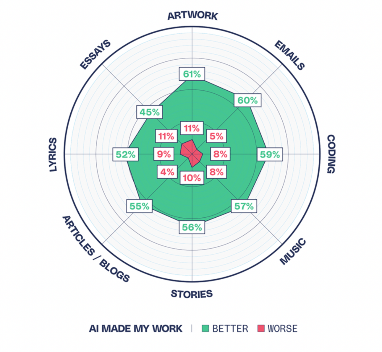 Across artwork, emails, coding, and music, most folks thought AI tools did a better job than they could have.