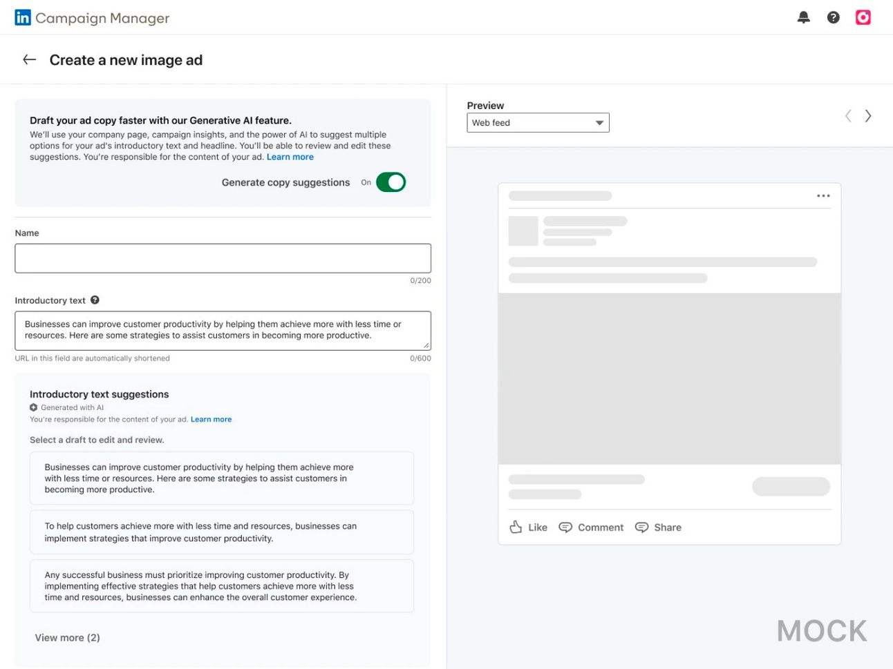 The AI uses data from the marketerβs LinkedIn page and Campaign Manager setting, including objective, targeting criteria, and audience, to suggest different introductory text to the ad.