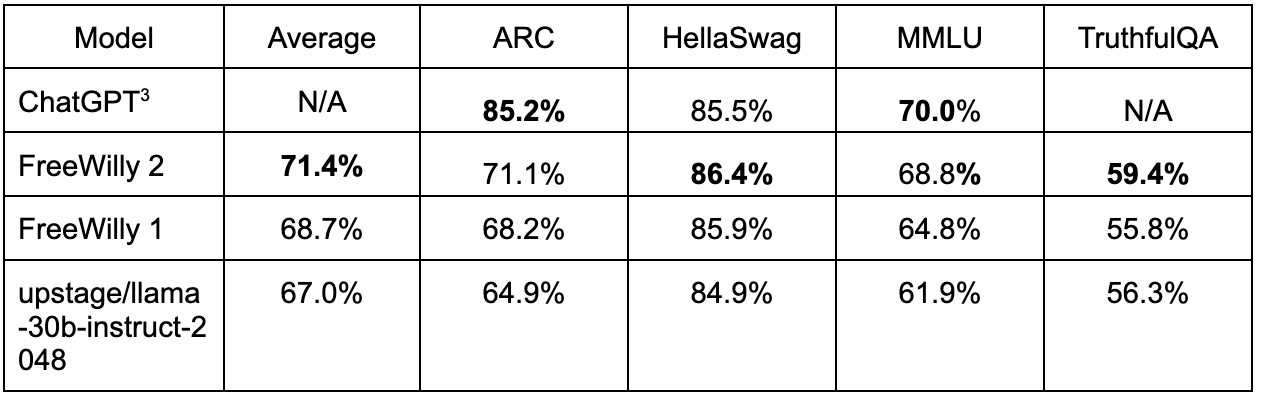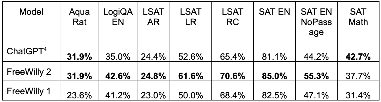 Translation: FreeWilly 2 nearly outperforms GPT 4 in most tests, and is comparable to GPT 3.5